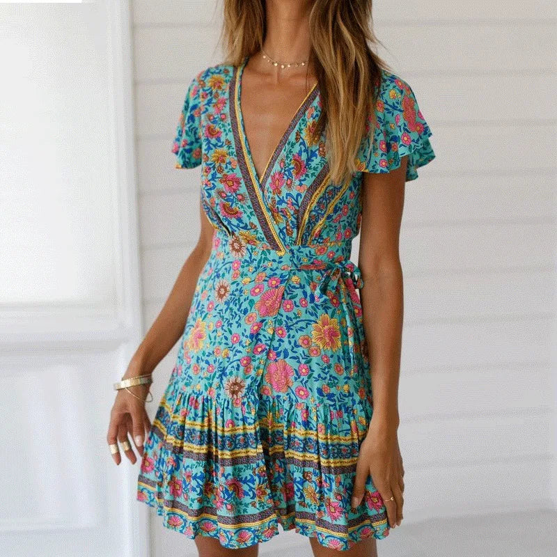 The V-neckline and A-line silhouette create a flattering shape that suits various body types, making it perfect for both casual and semi-formal occasions. Designed with a slim fit and natural waistline, this dress highlights your curves in all the right places. The short sleeves provide just the right amount of coverage while allowing for ease of movement. Stand out from the crowd this summer with its beautifully printed fabric that adds a touch of bohemian flair to your ensemble.