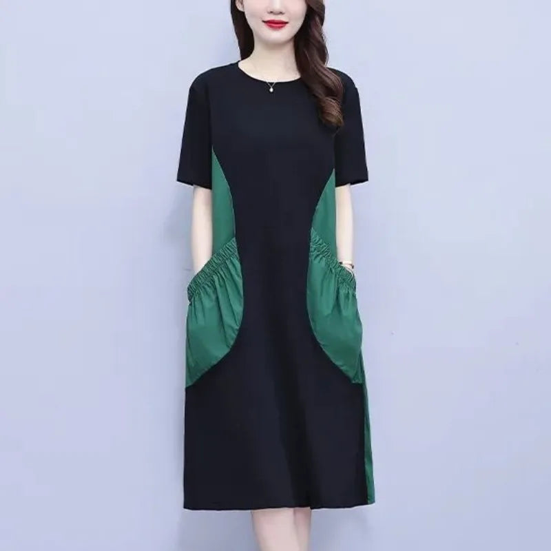 Home Sales Summer Women’s Pullover Round Neck Splicing Dress with Pockets